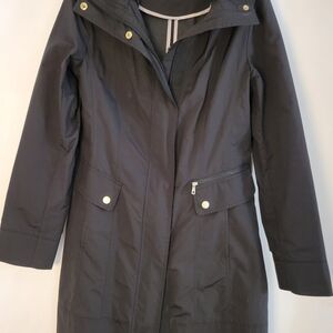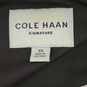 Stay stylish with Cole Haan Black packable hooded rain jacket. This rainy day essential is all about convenience and portability. Your perfect travel companion. Don't let rain stop yoyr adventures-zip up and get outside