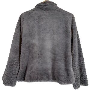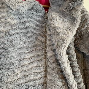 Pre-owned Patagonia Pelage Feather Gray Fleece Jacket size Medium. Unique curly polyester fleece meets vintage styling in this warm and softer-than soft, lined, hip-Length jacket. It has a subtle swing-style w/asymmetrical front closure with a double fleece collar, hidden front zipper and snap closure. It also has two on-seam hand warmer pockets. 100% Polyester