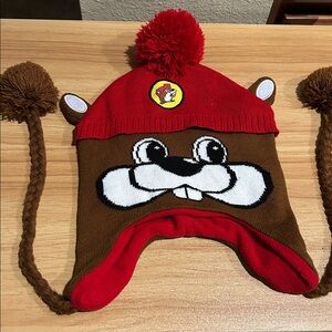 Buccees Fun beanie set featuring a cartoon patch. Includes a red beanie and a brown beanie with ear flaps.
