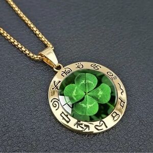 This elegant necklace features a gold pendant with a vibrant green four-leaf clover design. Perfect for adding a touch of luck and style to any outfit.