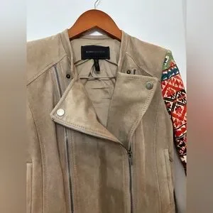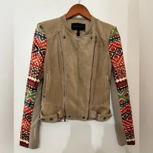 BCBGMAXAZRIA Women Aztec/Tribal Print Faux Suede Peter Moto Jacket Size Small. Side zipper pockets, zip up closure, Aztec print on sleeves, fully lined. In excellent pre-owned condition.
