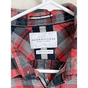 Denim & Flower Mens Medium Red 100% Cotton Flannel Button Up Shirt Preowned. Chest 20" Sleeve 25" Length 26" Measurements are approximate and may vary. Shipped with USPS.