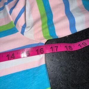 Vibrant striped top with white blue, green, and pink hues. Ideal for a lively look.