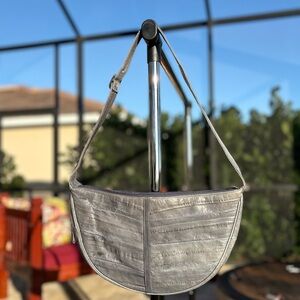 Beautiful vintage genuine eel skin leather shoulder bag in a versatile grey tone. Crafted from real eel skin leather, known for its distinctive ribbed texture, durability, and soft feel. A timeless minimalist silhouette that works perfectly for everyday wear.