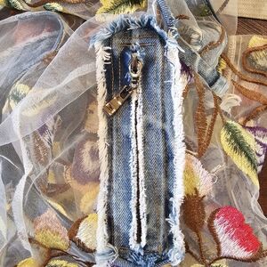 Sheer denim vest with floral embroidery. Ideal for layering.