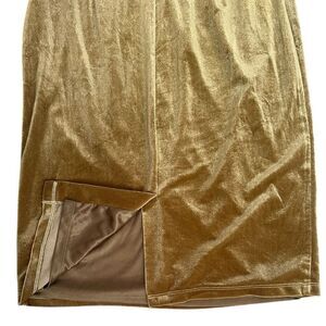 This gorgeous dress is perfect for holiday parties & cool weather weddings! Has ruching detail on right shoulder and should hit just below the knees on most wearers. Beautiful greenish gold (almost chartreuse) color!