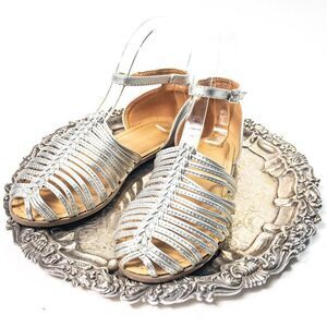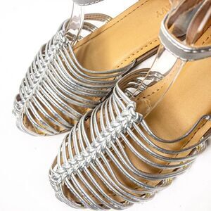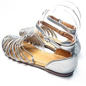 New, never worn, strappy sandals with ankle straps in bright, metallic silver by Old Navy.