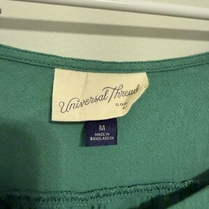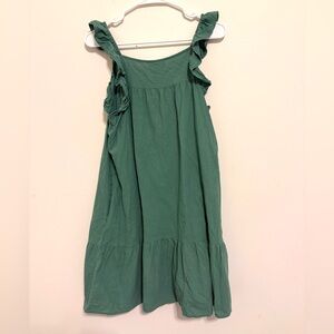 Universal Thread green sleeveless dress in women’s size Medium. Features ruffled shoulder straps, button-front detail, and a relaxed, flowy fit. Knee length. Made from soft lightweight cotton and includes side pockets for everyday comfort.