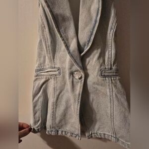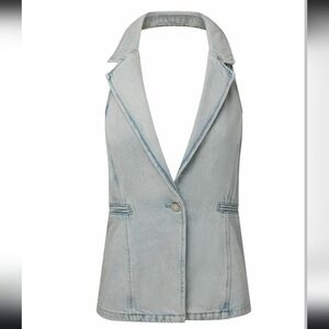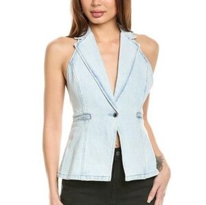 This denim vest features a low-cut V-neck with a single-button closure, notched lapels, front welt pockets, and an open back. Open back Low V neckline Notch collar One button at center front Two welt pockets Princess seams 100% Cotton Machine wash with like colors. Do not bleach. Tumble dry low. Iron cool. Do not dry clean.