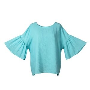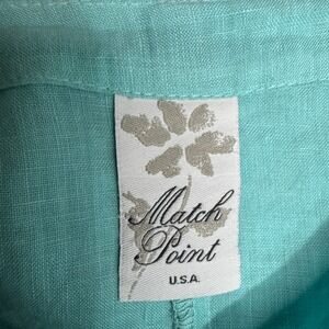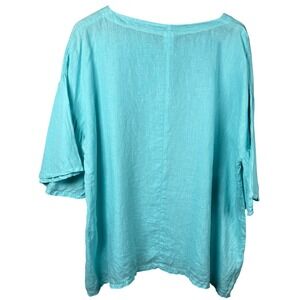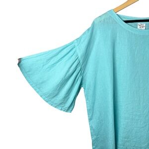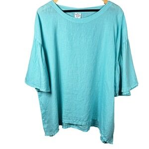 Match Point Turquoise 100% Linen Bell Sleeve Round Neck Top Sz XL Made USA