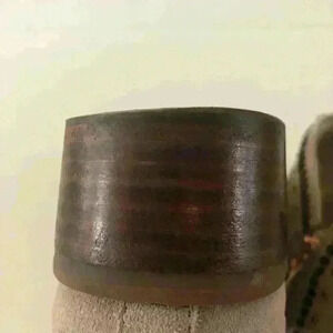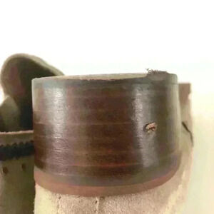 Has two small marks on left heel as shown in photos, otherwise it’s a perfect shoe. This modern casual shoe is ornamented with round metal studs, a metallic silk suede whip-stitch lining on a leather stacked heel. Shoe color is like the profile pic.