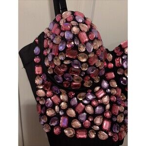 This Rhinestone Corset Bustier in size Large is a stylish and eye-catching piece perfect for a variety of occasions. The geometric pattern and rhinestone accents add a touch of glamour to this black satin bustier, making it a standout addition to any woman's wardrobe. With underwired support, adjustable straps, and a back closure, it not only looks great but also provides a comfortable and flattering fit. Ideal for festivals, hippie-inspired events, or any colorful and boho-themed outings, this bustier is a versatile and trendy choice for those looking to make a statement with their fashion.