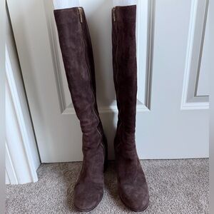 Chic over the knee boots in dark brown suede. Stylish and versatile for any wardrobe.