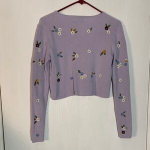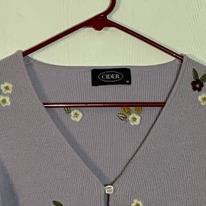 Charming lavender cardigan with floral accents. Features button-up front and V-neckline. Perfect for a stylish touch.