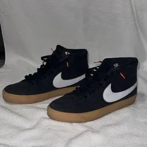 Nike sneakers with a bold black upper and white swoosh. Features a stylish gum sole. Ideal for casual wear.