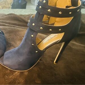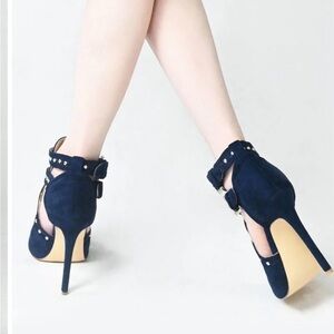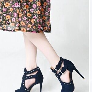 Chic navy high heels with stylish buckle accents. Peep-toe design for a modern look. Ideal for elevating any outfit.