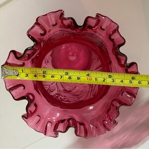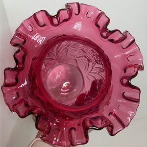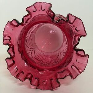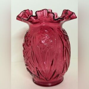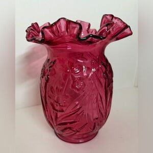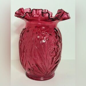 Fenton Cranberry glass vase with a ruffled rim and an embossed daffodil pattern