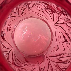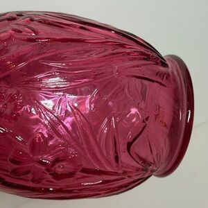 Beautiful vintage Cranberry glass vase featuring an embossed Daffodil pattern and ruffled edge. It is approximately 8” tall and 6” wide at the top. Perfect for adding a touch of elegance to any room.
