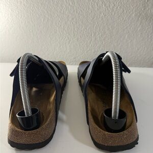 Stylish Birkenstock sandals. Navy blue straps. Comfortable cork footbed. Durable sole.