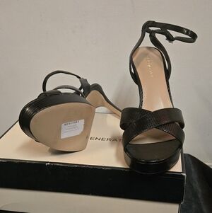 Sleek black platform heels with ankle strap. Perfect for a night out. These look to have been at least tried on, but look new and without flaws. In the box.