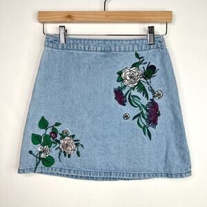 H&M X Coachella collection beautiful floral embroidered detail light wash denim mini skirt. Zipper and button closure at the back. US 4 but fits small and would best fit a 2 IMO. Check measurements to ensure fit. Never worn and in great condition!