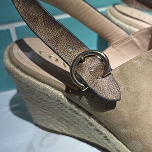 Chic Coach espadrille wedges. Beige suede with slingback design. Ideal for casual elegance.