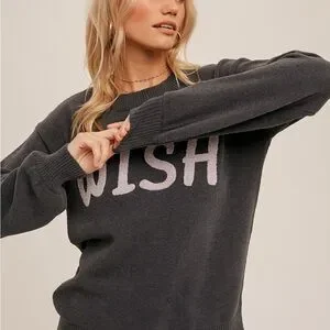 Chic charcoal sweater with bold 'WISH' motif. Ideal for layering and casual wear.