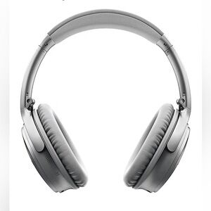 In excellent condition. Silver over-ear noise cancelling headphones by Bose. World class sound quality and over 20h of battery life (seriously, they last FOREVER!). Includes case, audio cable and airline adaptor. Charges with micro-usb cable (not included).