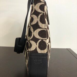 This is a vintage Coach Signature C shoulder bag made with a wool exterior and black leather trim. Expertly crafted with Coach's signature wool cream fabric and luxurious brown leather, the Coach Signature Wool Cream Shoulder Bag exudes sophistication and style. The elegant magnetic opening reveals a spacious interior, complete with a convenient zip up pocket, making it the perfect accessory for any occasion. This bag is stunning. No returns.