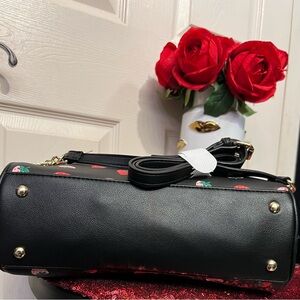 This ADORABLE Juicy Couture Bowler bag and card case Wallet features a playful strawberry print on a sleek black background.
