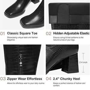 These new Suedi women's knee-high black croc embossed boots in size 9 feature a chunky heel and square toe design, making them perfect for various occasions such as parties, casual outings, formal events, and business meetings. The boots are crafted from faux leather with a fabric lining, a mid heel 2.4”, and a synthetic rubber outsole for slip resistance. The pull-on closure and inner side zipper add convenience, while the hidden elastic ensures a comfortable fit that conforms to your natural curves. Perfect for the winter, fall, and spring seasons, these stylish and versatile boots are a must-have addition to any woman's shoe collection. Suedi’s knee high boots showcases unique taste and fashion elegance that keeps a perfect balance of fashion and comfort.
