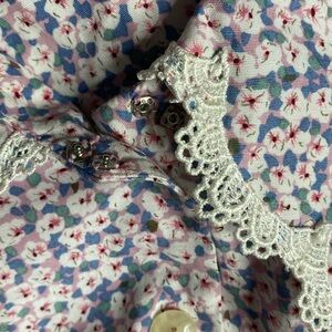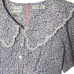 • Details: Oversized scalloped lace collar, dainty pearlized buttons, and short flutter sleeves.