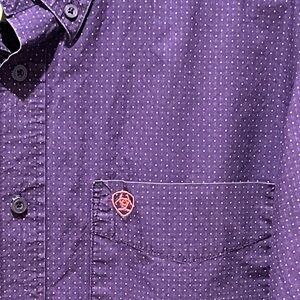 Ariat shirt with a purple base and pink dot pattern. Elegant and versatile.BUTTON DOWN, 100% COTTON, PRE OWNED, HAS SOME WEAR ON BACK OFF SLEEVES, UNDER ARMS, SEE PHOTOS, STILL HAS ITS TOUGH COTTON FABRIC INTEGRITY, NO TEARS OR HOLES, WESTERN, RANCH, RODEO WEAR: