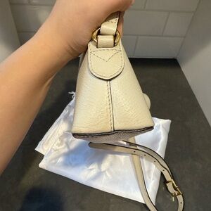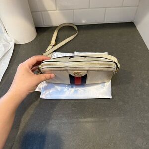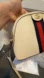 Does show signs of use on exterior. Leather rubs on strap and few spots on bag. Light glue mark on top.