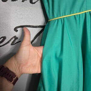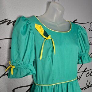 Green dress with yellowing detailing, flower and bows.