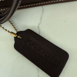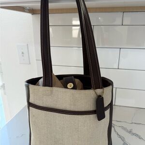 Vintage Coach tote with flax cream color linen with mahogany brown leather trim. Vintage coach mahogany leather at its best trims the sides, straps and bottom of bag…the shoulder bag has an inside zip with a button closure. Perfect for everyday use & perfect for the upcoming Spring/Summer season. Used only a few times and kept nicely stored. This bag was gently and kept in excellent condition.