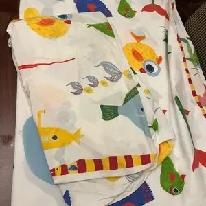 Vibrant fabric with a playful fish print. Features green, red, and yellow colors on a white background.