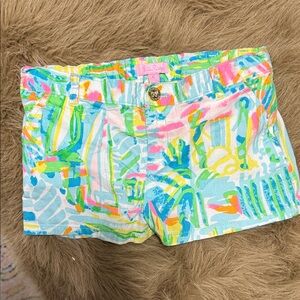 Bright and playful shorts. Features a mix of blue, green, pink, and yellow. Perfect for a vibrant summer look.