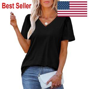 V-Neck Puff Sleeve Blouse Loose Fit Casual Chic Summer Tops Dressy