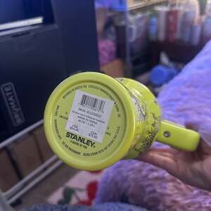 Unique 40oz Stanley + Starbucks tumbler with an eye-catching laser-engraved celestial design. This vibrant lime green tumbler features a detailed sun face pattern surrounded by stars, adding artistic flair to your daily hydration. Perfect for collectors or anyone seeking a stylish and functional large-capacity tumbler. Includes handle for easy carrying. Excellent pre-owned condition.