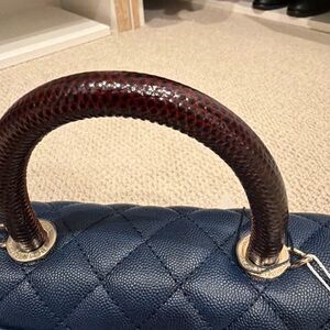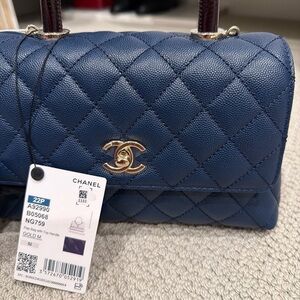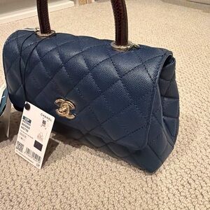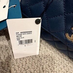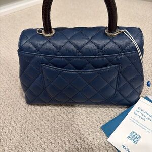 Chic Chanel satchel in dark blue. Iconic quilted pattern with elegant gold accents. Ideal for stylish outings. brand new includes the dust bag and the box.