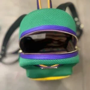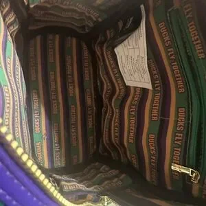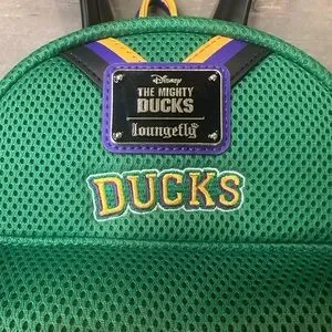 Disney x Loungefly The Mighty Ducks mini backpack featuring Conway #96 jersey-style mesh, embroidered DUCKS lettering, and interior “Ducks Fly Together” lining. Green, purple & gold colorway with zip front pocket and side pockets. Rare collector piece — perfect for Loungefly or Mighty Ducks fans.