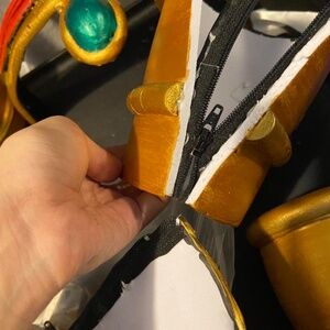 Comes with: wig (and attached ponytail made from toilet paper and wire. ), brown cloak attire with gems on it, collar, arm cuffs ( will try to glue back before shipping on the zipper loosened one) and leg cuffs, necklace, headpiece, forehead gem, extra materials and fabric.