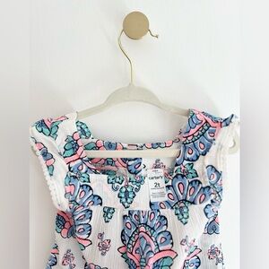 BEAUTIFUL Carter’s tank top with vibrant patterns. Features blue and pink paisley designs on a white background, ruffle cap sleeves with lace detail on the edges, and three button closure on top back for easy changing. VERY pretty and quality lightweight material!!