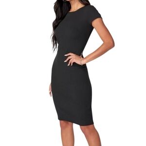 The perfect LBD! Rounded neckline. Short sleeves. Soft and stretchy ribbed viscose/elastane fabric. Center seam detail at back. Bodycon fitted silhouette. Unlined. Pullover style.
