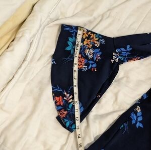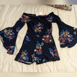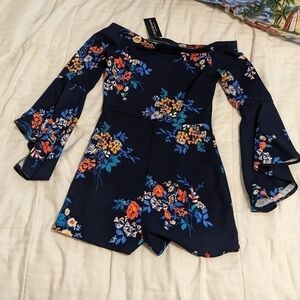 fashion Nova pretty floral shorts romper with full flutter sleeves size small. this is new with tags although I did discover what looks like either paint or maybe makeup on the interior of one of the sleeves but it doesn't affect the exterior hardly at all. this has a lot of fun details. it can be either a wide boat neck or off the shoulders. the pattern in the colors are really pretty. and besides the flaws I listed earlier this is an excellent condition