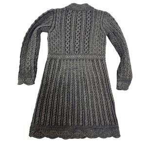 An Aran Crafts Ireland 100% Merino Wool Cable Knit Button Front Dress in a versatile grey color. This midi-length dress showcases intricate cable knit patterns throughout, a flattering fitted waist, and a decorative scalloped hemline. It features a button-front closure and two front pockets. Perfect for a cozy day out or a refined evening gathering.