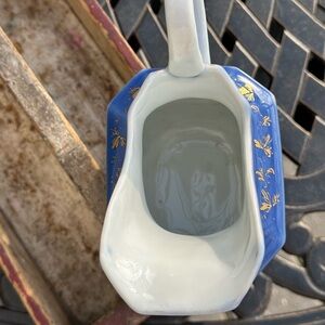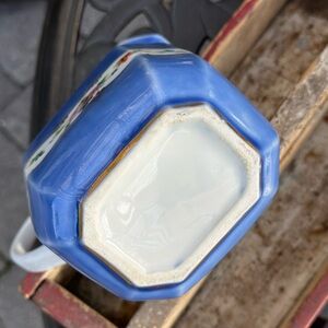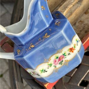 This pitcher has no marks but is most likely an example of an Old Paris Porcelain Pitcher. These pitchers are very collectible, and have hand painted flowers and gilding decoration. No chips or cracks. The soft colors of cobalt blue, red, pink, orange, yellow, green, and soft white are lovely. It is 6” in height, and about 6 1/2” wide, from the tip of the spout to the top of the handle. Thanks for looking!
