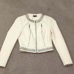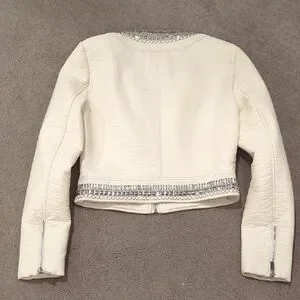 Stylish faux leather jacket with eye-catching silver embellishments. Fitted. Worn once, no defects.
