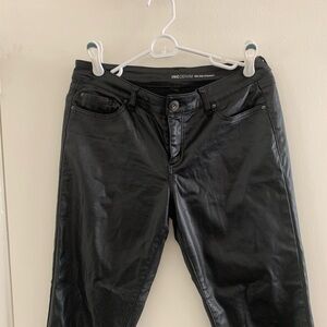 Sleek black faux leather 5-pocket pants. Run Big. Straight Leg. Length 30”.